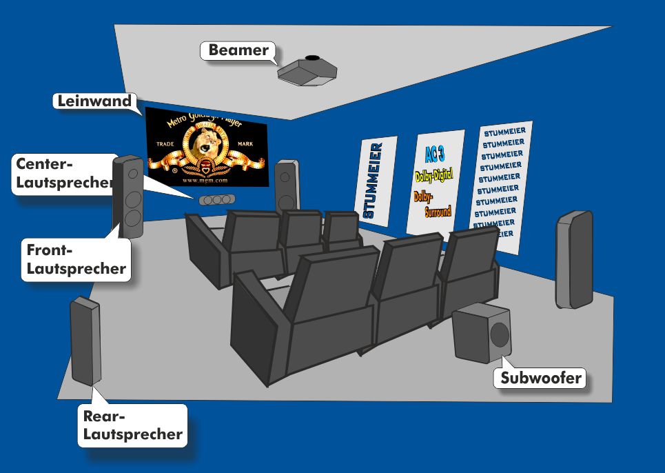 | Was braucht man für eine gute Heimkino-Anlage? - Flachbild-TV oder Beamer mit Leinwand - AV-Receiver - BluRay-Player - Lautsprecher-Set mit mindestens 5 Lautsprechern -> 2 Front-Lautsprecher -> 1 Center-Lautsprecher -> 2 Rear-Lautsprecher Optional: -> Sub-Woofer zur Bass-Unterstützung -> Rear-Center-Lautsprecher |